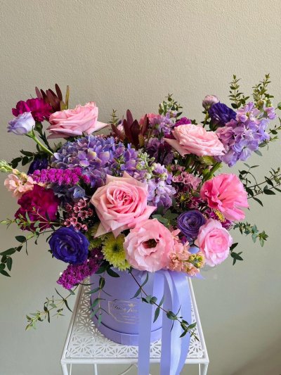 Violet Rhapsody is a vibrant box arrangement that sings with bold color and joyful energy. Featuring rich red and blush roses, purple orchids, pink carnations, and cheerful chrysanthemums, this bouquet brings life to any celebration. A perfect gift for birthdays, congratulations, or romantic surprises.